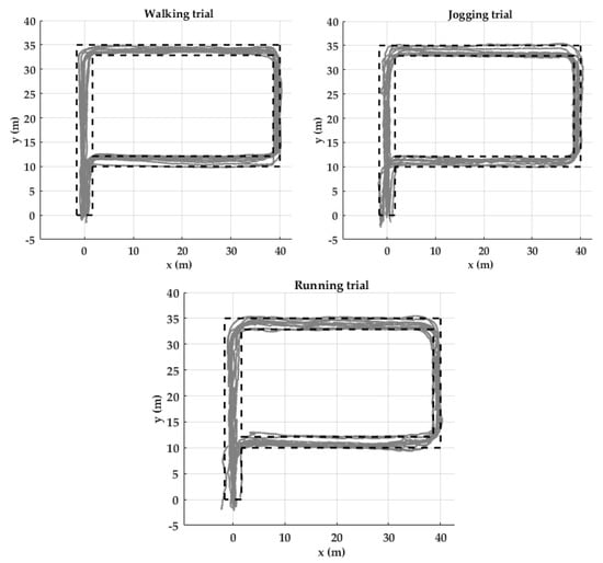 As a result of the better detection of TO and MS obtained by using the algorithms proposed in this study, there is also a better trajectory reconstruction since there were fewer strides out of trajectory (SOT) and shorter RPE for jogging and running activities. This demonstrates two things. The first is the importance of performing a correct detection of TO and MS for trajectory reconstruction. The second is that if the complementary filter does not have precise data to perform the ZVUs, it is not capable of modeling errors in speed on its own, even if its parameters were tuned. It has also been demonstrated that by properly detecting TO and MS, the complementary filter is capable of modeling errors in walking, jogging, and running strides.