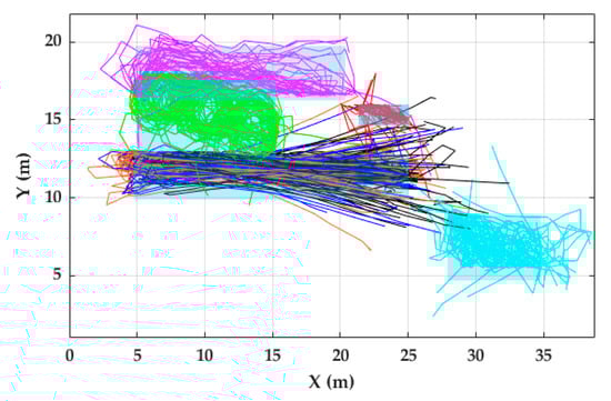 Most of the trajectories were inside the zones (Figure 13 and Figure 14). The trajectory reconstruction of activities W-20, J-20, and R-20 describes two straight trajectories, joined by a 180-degree turn. The trajectory reconstruction of W-Slalom allows sight of the area where the tables are located. The W-Posters activity includes non-straight strides, which are well described in the trajectory obtained. Regarding the circuit activities, although most of the strides are inside the activity zones, some trajectories lead towards the outer part of the activity zone. Others lead towards the internal part of the circuit (Figure 13).
