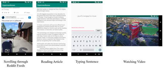 32]. For each condition of sitting and walking, there were four tasks: reading an article, scrolling through a social media feed, typing sentences, and watching short videos (