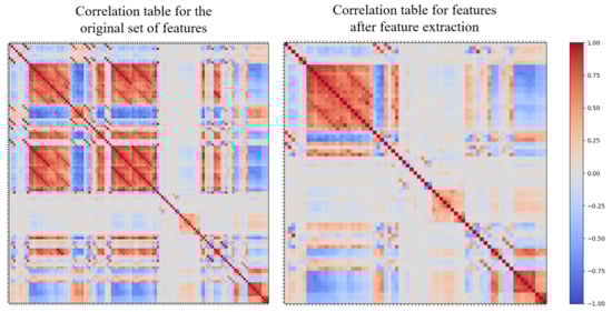 35]; one pair was removed from the feature list. The comparison of the correlation table before and after removing these features is shown in