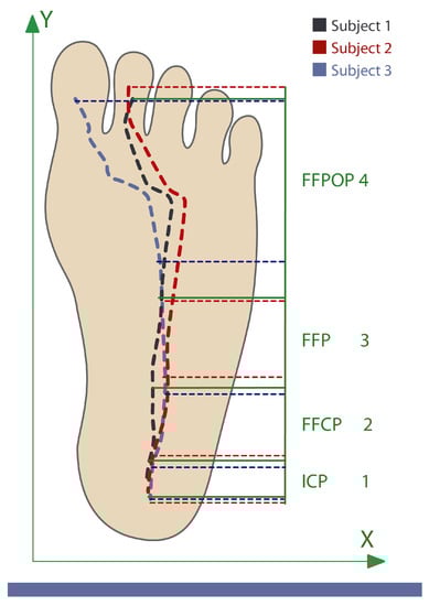 This is defined as the location in the plane where a resultant force vector is generated. This force represents different forces that are applied in different points of the plane. It is calculated as the mean of all forces weighted by the applied position. It reveals useful information about stability and balance during the gait [13]. The center of pressure (CoP) changes its position along the gait, following patterns associated with gait cycles. Its trajectory begins under the heel then goes straight along the lateral area of the midfoot to the metatarsal zone and ends in the hallux [13]. Different studies have used the CoP to study human gait patterns as it provides biomechanical information associated with gait dynamics. These works propose that CoP position and velocity allows for the segmenting of gait phases and subphases [17,32,33]. Figure 2 shows the relation between CoP trajectory and each subphase of the stance phase [32].