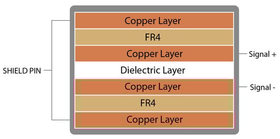 Capacitive sensors were manufactured with two superimposed flexible copper films (commercially available flexible PCB from “Fab in a Box”), separated by a flexible dielectric film. The chosen dielectric material was “Electroactive Ferroelectret Film” by EMFIT. This dielectric material was chosen for its properties shown in Table 2, which compared with PDMS, has more adequate properties, making it appropriate for the custom-shape in-shoe capacitive sensor. Its thickness and dielectric permittivity are the main properties that make it suitable and allow for capacitive pressure sensor construction within the required capacity-to-size ratio. This material is pressure compressible, allowing the capacitance to change while returning to its nominal thickness when the pressure is released. The developed capacitive sensors have four copper layers and one dielectric layer (see Figure 4) [36]. The top and bottom copper layers are connected to the shield pin of the capacitance-to-digital converter protecting the sensor from electromagnetic noise and disabling proximity measurement caused by parasitic capacitance through air. The sensor dimensions are 10 mm × 10 mm with a thickness of 0.41 mm. This small sensor size guarantees a single applied pressure over the sensor area as it is smaller than any anatomical zone in the foot.