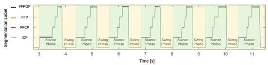 Analyzing the stance phase, four subphases can be defined, delimited by the events from one to five. The initial contact phase (ICP) occurs when the heel contacts the surface the first time, then the forefoot contact phase (FFCP) starts when the metatarsal heads contact the ground for the first time. Next, the flat foot phase (FFP) is when the middle foot contacts the surface. Lastly, the forefoot push-off phase (FFPOP) starts when the metatarsal heads and the toes are the only support in contact with the ground. The toe-off event is considered the transition between the stance and swing phases [13,17].