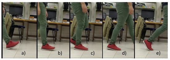 Moments of transition of detected subphases with the implemented algorithm for the foot with the red device. (a) Transition from swing phase to ICP. (b) Transition from ICP to FFCP. (c) Transition from FFCP to FFP. (d) Transition from FFP to FFPOP. (e) Transition from FFPOP to swing phase.