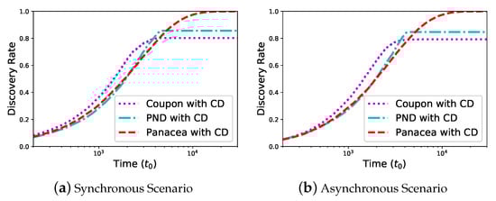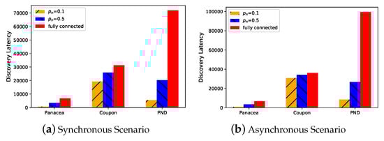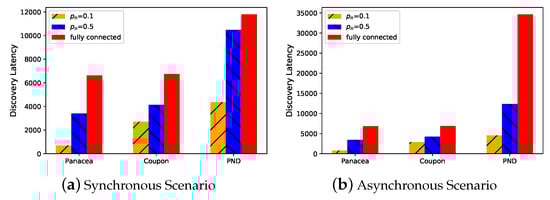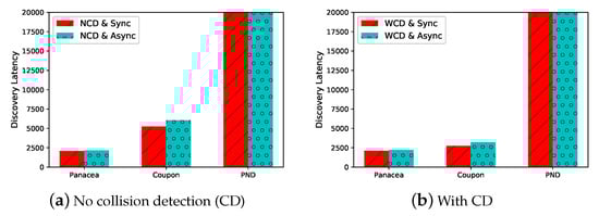 Panacea-NCD and Panacea-WCD have the lowest discovery latency under both synchronous and asynchronous scenarios when .