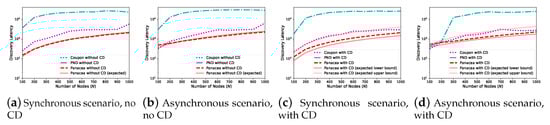 Panacea-NCD and Panacea-WCD achieve lowest discovery latency for both synchronous and asynchronous scenarios when and N increases from 100 to 1000.