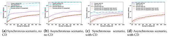 When the network is generated according to the nodes’ positions, we compare the neighbor discovery algorithms in Figure 5. When the nodes are deployed according to the uniform distribution and the number of nodes N increases from 100 to 1000, we also evaluate their performance for four different scenarios; the results show that the discovery latency increases when N increases and Panacea could achieve the lowest discovery latency among them. In addition, comparing with the expected discovery latency of Panacea, the evaluation results corroborate the theoretical analyses in Equation (10) and Equation (20).