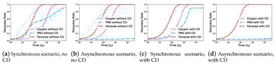 We evaluate the discovery rate when and all nodes are uniformly distributed. As shown in Figure 7, Panacea achieves higher discovery rate than others; both Panacea-NCD and Panacea-WCD could reach discovery rate. Coupon could reach (nearly) discovery rate in some scenarios when the network is sparser than that in Figure 6; this is because Coupon is more applicable to a sparse network.