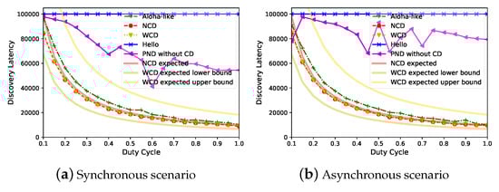 Since different applications could set different duty cycle values, we evaluate the tradeoff between discovery latency and duty cycle. When , Figure 8 demonstrates that Panacea has a better tradeoff between discovery latency (y-axis, number of slots) and duty cycle (x-axis); the discovery latency is proportional to for Panacea, which corroborates our analyses. The evaluated discovery latency of Panacea-NCD fits quite well with the expected discovery latency, while the evaluated latency of Panacea-WCD is also located within the lower bound and the upper bound of the expected latency. PND and Hello have higher latency, because PND’s collision slots make up of the time, and Hello’s collision slots make up of the time. The power–latency product [15] measurement is the product of the average power consumption with discovery latency. The power–latency product of Panacea is 9213, while that of Aloha-like is larger, and PND is times larger than Panacea in the synchronous scenario. The PND algorithm’s performance is unstable when the duty cycle increases, this is because PND suffers from irregular collisions and the algorithm varies the sending probability according to different scenarios. In addition, we only measured the average discovery latency of 1000 separate runs.