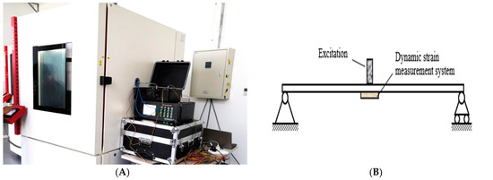High and low temperature dynamic strain test. (A)Test equipment, (B) Assembly drawing of experiment beam.