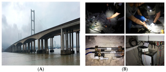 Test verification of Jiujiang Bridge. (A) Jiujiang Bridge, (B) Test process.