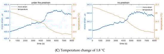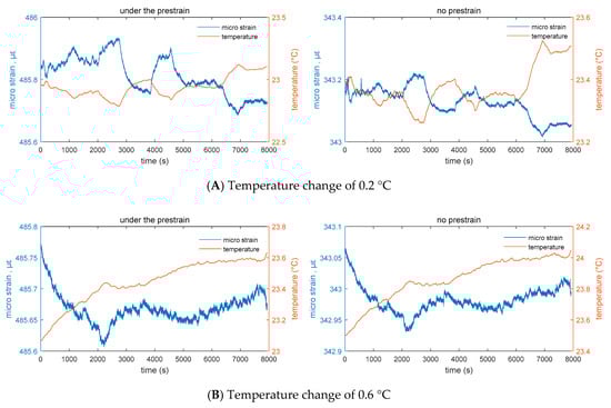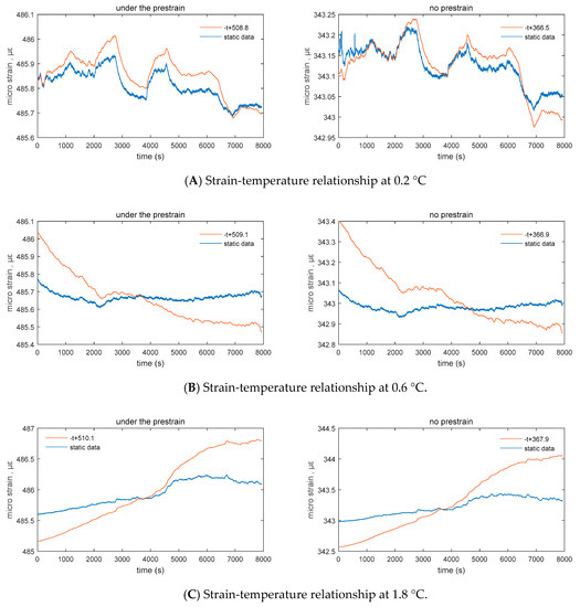 At the same time, the relationship between strain and temperature was analyzed during a temperature variation of 0.2, 0.6, and 1.8 °C. Figure 4, Figure 5 and Figure 6 show that the correlation did not change with the change in temperature. A stable negative correlation curve relationship was maintained. Among them, sensor A has a relatively weak induction of temperature and deformation under the prestrain of 140 , which can be characterized as shown in the figure. In the absence of external excitation, the change in experimental numerical temperature is less than the perception of sensor B. At the same time, the corresponding strain produces a small change in the output. Sensor A temperature and the strain relationship map shows that in the free state of acquisition device, the experimental temperature will also have a corresponding change during small changes. However, both sensors A and B can consistently respond to the corresponding output temperature and strain signals (Figure 8).