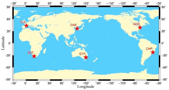 For the purpose of evaluating the availability of HVCE posterior weighting strategy in robust Kalman filtering and analyzing the weight proportions of GPS, BDS, GLONASS and Galileo in different areas, we selected twelve IGS stations located in five different continents to form six independent, short baselines shown in Figure 2. The basic information of all stations and baseline distributions for relative positioning is shown in Table 1.