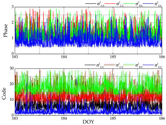 Since phase observations play a more significant role in achieving high accuracy positioning, the weight proportion of phase observations has to be treated carefully. Figure 4 presents the time series of daily averaged phase variance of unit weight for the whole 30 days. Note that the GPS phase variances of unit weight are not shown because its value is 1.0, by definition in Equation (12).