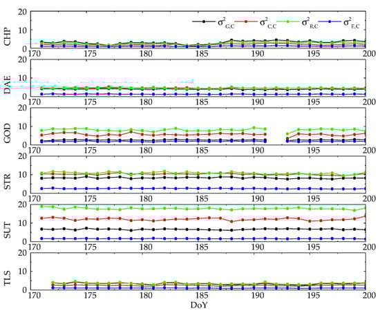 On the contrary, the discrepancy of code weight proportion between different baselines is quite evident. In this part, the GPS code unit weight is estimated because the GPS phase unit weight is set as the reference. It should be noted that the initial noise ratio between GPS phase and code is , as mentioned in Section 2. Figure 5 depicts differences of code variance of unit weight for GPS, BDS, GLONASS and Galileo are obvious in all baselines. It is found that in the test of GOD, STR and SUT, and the code variances of unit weight ranging from 2.5 to 11.0 in baseline GOD and STR, while reaches 17.8 in SUT. In baseline DAE, the , and are similar to each other, while the is the smallest one. The relationships and are found in CHP and TLS.