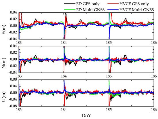 To reduce the time consumption of the HVCE Multi-GNSS method, the previously obtained variances of unit weight over 30 days in Table 4 were averaged and then frozen as a priori information in the positioning experiment, the aforementioned FVUW strategy. As no additional variances of unit weight needed to be estimated, the time consumption of the FVUW Multi-GNSS method was compared to the ED Multi-GNSS method; see Table 7. Indeed, compared to the HVCE Multi-GNSS method, the FVUW Multi-GNSS method saves 88% time on the adjustment process. The positioning performance of the FWUV Multi-GNSS method is presented in the following, and time series of positioning errors for SUT are depicted in Figure 8 as examples.