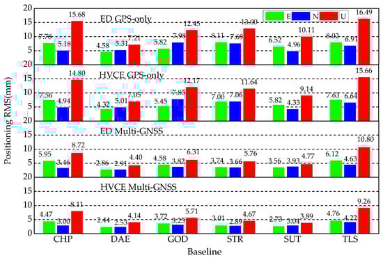 As mentioned in the introduction, Multi-GNSS can be beneficial to positioning accuracy compared with single-GNSS [3,4,5,6]. The RMSs of the four strategies with respect to each baseline over 30 days are shown in Figure 7, and it is obvious that the RMSs obtained by Multi-GNSS strategies are lower than by GPS-only strategies in all baselines. Table 5 presents the accuracy improvement percentages obtained by ED and HVCE Multi-GNSS strategies compared with the corresponding GPS-only strategies for all baselines. The improvement obtained by the Multi-GNSS strategy differs between baselines, but is more than 20% in every baseline. Generally, the Multi-GNSS achieves more than 30% improvement in each component in the ED method, and more than 40% in the HVCE method, compared with the corresponding GPS-only strategy.