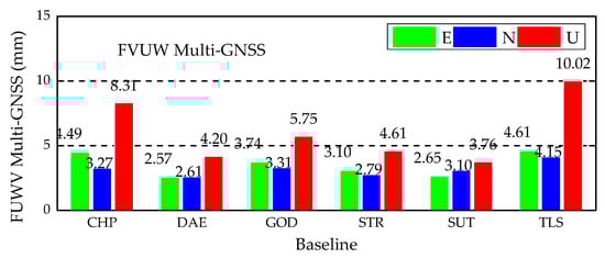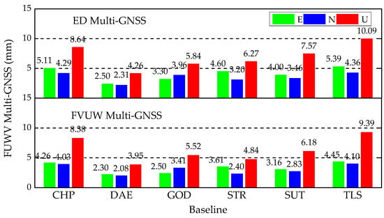 The Multi-GNSS positioning RMSs of FVUW Multi-GNSS from DoY 171 to 200 in 2019 are shown in Figure 9, and are lower than the RMSs of ED Multi-GNSS shown in the third panel of Figure 7. Moreover, Table 8 shows that the Multi-GNSS positioning accuracy is improved by FVUW method with regard to ED method. Referring to Table 8, the improvement obtained by FVUW Multi-GNSS is comparable to the HVCE Multi-GNSS, as the differences between the improvement percentages of the two strategies are lower than 3% for the most of baselines. The average improved percentages of all baselines are presented in the right-most column of Table 8. Generally, the improvement obtained by FVUW method is 1% lower than HVCE, but it still improves the HVCE accuracy by more than 10%, compared with ED Multi-GNSS.