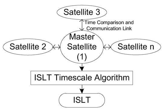 The ISLT is formed as a synthetic clock by utilizing the frequency stability of an ensemble of satellite clocks. One satellite is selected as the master satellite, whose working clock is noted as the reference clock, and other satellites are named as slave satellites. It should be stated that the reference clock does not mean the time reference of the constellation; rather, it is a center node of time comparison. All the slave satellites compare their clocks with the reference clock through ISLs periodically. The time comparison is limited by inter-satellite visibility. The satellite visible to the master satellite is defined as an anchor satellite that is able to directly compare time through an ISL. The one not visible to the master satellite must compare time by the relay of an anchor satellite. The time comparison results are collected by the master satellite and used to generate the ISLT with a timescale algorithm. A brief establishment framework of the ISLT is shown in Figure 1. n is the number of satellites that participate in the joint timekeeping, and the master satellite is numbered 1.