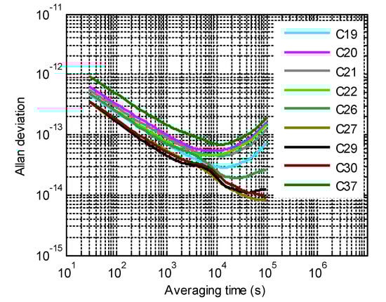 The MPOD clock products have absorbed the orbit mismodeling errors because of the correlation between the satellite orbits and clocks. In order to reliably identify the background noises of BeiDou spaceborne clocks, the periodic signal at 1, 2, 3, and 4 cycle(s) per revolution (cpr) is removed from clock deviations []. According to the detrended clock deviations, Allan deviations (ADEVs) were computed and are shown in Figure 2. The three noise components are related to Allan variances of the clocks by: