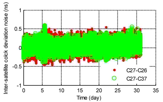 The inter-satellite time comparison performance was analyzed with real ISL measurements of the 31 days. ISL relative clock deviations were calculated with Equation (16). The daily inter-satellite clock deviations were fitted with two-order polynomials to remove the initial clock deviations, frequency deviations and frequency drifts. The detrended clock deviations of pairs C27−C26 and C27−C37 are illustrated in Figure 3 as examples, which demonstrate the comparison precision was better than 0.2 ns (root mean square error: RMSE).