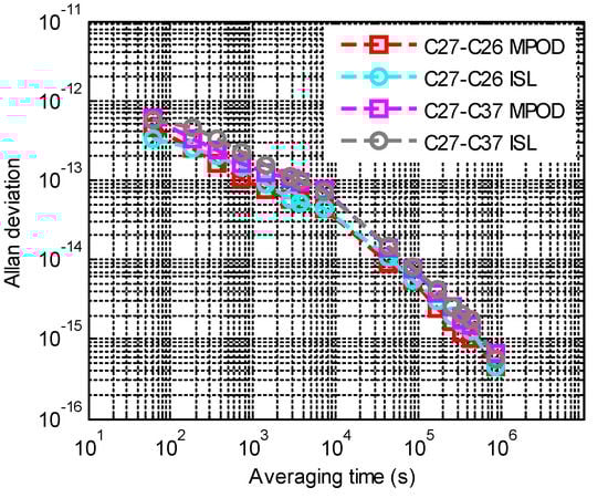 By making difference between the MPOD clock deviations of a satellite pair, we were also able to get the inter-satellite relative clock deviations. The deterministic components were removed from the MPOD relative clock deviations. The noise characters of ISL and MPOD relative clock deviations were analyzed with Allan deviations, as shown in Figure 4. It should be noted that the noise of ISL clock deviations was filtered through a low pass filter, and the cycles per revolution were removed from MPOD clock deviations. According to the result, the noise characters of the two types of relative clock deviations were consistent.