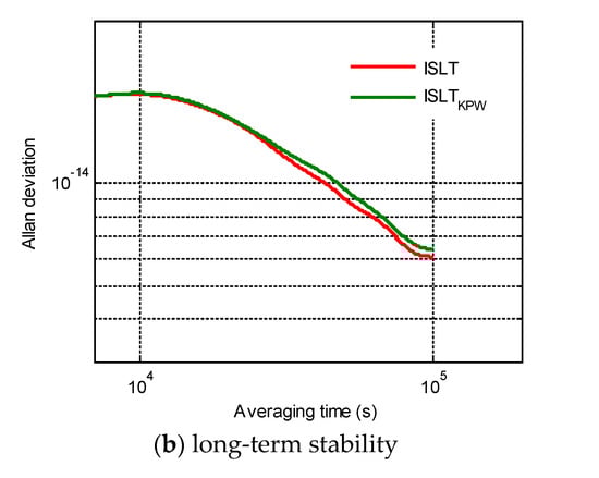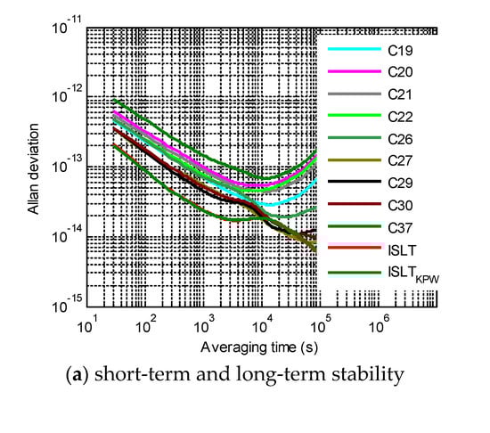 For an averaging time of less than 7000 s, the frequency of the ISLT was more stable than that of all the spaceborne clocks. However, the Allan deviation slightly increased around 10,000 s of averaging time, possibly because of the mismodeling non-power-law behaviors of PHMs or the flicker frequency noises (FFM) of Rb clocks. Even so, the daily stability of the ISLT reached 6 × 10−15, which was better than the best PHM of the four satellites.
