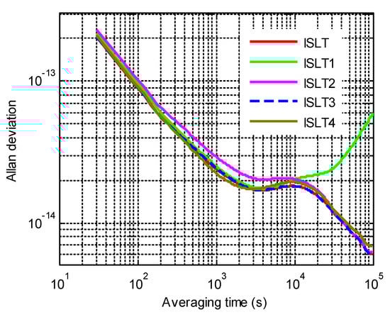 Figure 7 demonstrates the ISLTs kept by different ensembles of satellite clocks, as illustrated in Table 3 to evaluate the influence of the clock ensemble. Since the long-term stability of PHMs was obviously superior to Rb clocks, the frequency of the ISLT2 was more stable than the ISLT1 in the long term and approaches to the ISLT after 30,000 s of averaging time. Meanwhile, the short-term stability of the ISLT1 was better than the ISLT2 because the weights of the ISLT1 were more dependent on the short-term stability of the Rb clock ensemble. The ADEVs of the ISLT3 and ISLT4 indicate that the malfunction of a timekeeping clock has little influence on the stability of the ISLT, especially for the one with a small weight.