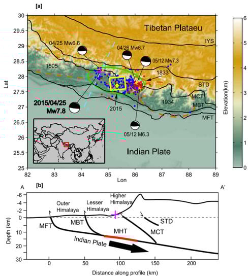Seismo-tectonic setting of the Himalayan region (modified with permission from [27]) (a) tectonic setting of the Himalayan Region with topography. MFT = Main Frontal Thrust, MBT = Main Boundary Thrust, MCT = Main Central Thrust, STD = Southern Tibetan Detachment System, IYS = Indus–Yarlung Suture. The purple cross is the epicentre of the main shock and yellow dots are large aftershocks. Focal mechanisms are shown by black and white beach balls. The blue and red dots are aftershocks (Mw > 3.5 that occurred between the mainshock (25 April 2015) and the largest aftershock Mw 7.3 (12 May 2015), and after the largest aftershock till 30 May 2015, respectively. The brown ellipses show rupture areas of the past 1934 (Mw 8.1), the 1833 (Mw 7.6) and the 1505 (Mw 8.2) earthquakes. The green ellipse shows the approximate fault plane of the 2015 Mw 7.8 earthquake. The yellow square is the study area on which this research is performed. (b) cross section along AA’ in (a) that shows the approximate location of slip of Mw 7.8 earthquake with epicenter location (purple cross) and approximate fault rupture (red line). MHT = Main Himalayan Thrust.