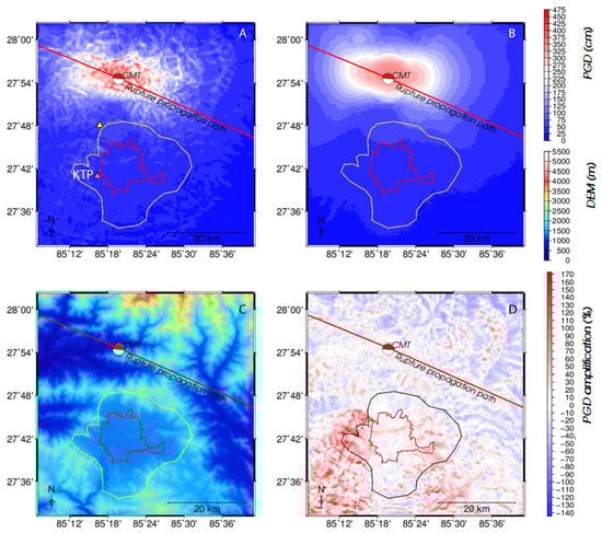 Surface topography and peak ground displacement (PGD) model for the 25 April 2015 Mw 7.8 Nepal Earthquake. (A) absolute PGD for a model with surface topography. The recorded data at Kiritipur municipality office accelerometer station (KTP), located on bedrock, is compared with the synthetic seismogram. (B) absolute PGD for a model without realistic surface topography. (C) Shuttle Radar Topography Mission (SRTM) digital elevation model of the study area; (D) PGD amplification map (in %). The rupture propagation path (red line) indicates the path of dominant release of seismic energy.