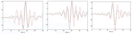 Comparison between the observed (black line) and synthetic (red line) time histories of peak ground acceleration (PGA) (cm/s). The three components N, E and Z are presented.