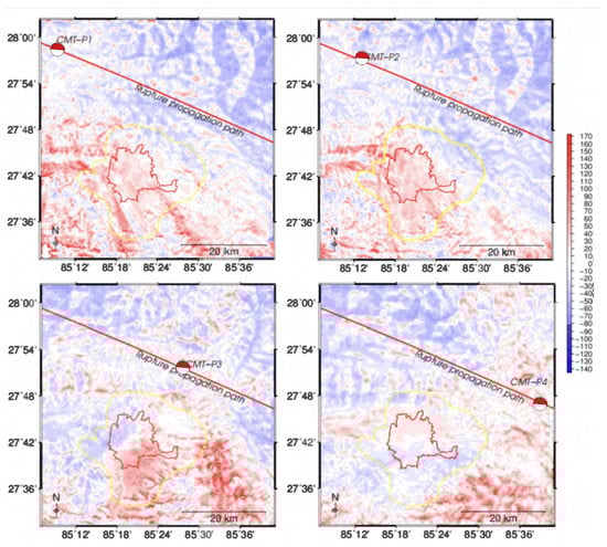 PGD amplification for scenarios with centroid moment tensor (CMT) at four different locations (P1 to P4) along the fault-rupture line. Subfigures show the expected amplification outcomes for maximum seismic energy release at points P1, P2, P3, and P4, as indicated in the figure.