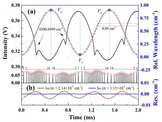 To test the accuracy of Equations (4) and (5) in the description of the laser frequency response, an experimental study on CO (2←0) R (11) transition at 4300.6999 cm−1 was conducted according to the setup in Figure 1. A sine wave with a frequency of f = 1 kHz and an amplitude of ±10 mA@140 mA was used to modulate the DFB laser (NORCADA Canada). The relative frequency of the DFB laser was characterized with a Fabry–Perot etalon (Thorlabs SA200-18C) with a free spectral range (FSR) of 1.5 GHz ± 3 MHz. The nominal FSR value was experimentally checked by measuring the spectral interval between two strong CO transitions (4300.699869 cm−1 and 4303.623335 cm−1 tabulated in HITRAN 2016 [38]). Although the measured FSR is 1.498 GHz, which agrees well within the uncertainty with the nominal value, the nominal FSR, 1.5 GHz, was used in the manuscript considering the uncertainty in the line positions. Signals from the FP etalon and the transmitted light intensity detected by the HgCdTe detector (Vigo PVI-2TE-3) are shown in Figure 2. The detected etalon fringe peaks are marked with red “Δ” symbols, and the wavelength interval between two adjacent peaks equals the FSR (0.05 cm−1). The reassigned relative wavelength points are shown by the pink “○” symbols together with its best-fit curve with Equation (4). As illustrated in Figure 2b, the best-fit residual that considers only the linear response, marked by the red line, presents pronounced sinusoidal structure at twice the modulation frequency, indicating the non-ignorable 2ω nonlinear term [37]. In contrast, the best-fit residual with Equation (4), shown by the blue line, is reduced by more than one order of magnitude with a standard deviation as small as 1.15 × 10−4 cm−1. The best-fit parameters , a1, a2, a3, η, φ2, and φ3 in Equation (4) are 4.777 × 10−1 cm−1, 4.332 × 10−1 cm−1, 3.193 × 10−3 cm−1, 2.181 × 10−4 cm−1, 0.9937 π, −0.9169 π, and −0.9868 π, respectively.