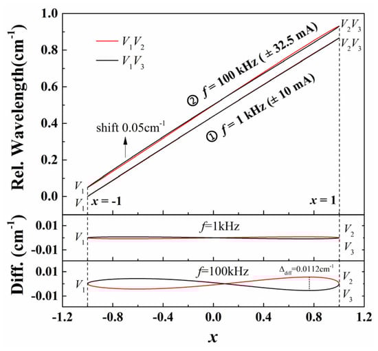 The laser frequency as a function of variable x in the V1V2 and V1V3 edges can be obtained by substituting the above best-fitted parameters, , a1, a2 and so on, into Equation (5), as shown by the lines of group ① in Figure 3. The bottom panels show how much the laser frequency deviates from its average, which has a clear ∞-shaped structure and equals 0 at two ends (x = ±1). As shown in Equation (6), when the nonlinearity is ignored (a2 = a3 = 0), the laser wavelength curves in both edges merge into one line. Additionally, this discrepancy between both edges becomes more prominent as the modulation frequency increases for the same laser. Lines in group ② in Figure 3 illustrate the laser wavelength response with a modulation frequency f = 100 kHz (modulation current ± 32.5 mA@140 mA, wavelength scan range a = 0.881 cm−1, current coefficient 0.0136 cm−1/mA). The largest difference between the two edges reaches 0.0112 cm−1. Therefore, considering the significant nonlinearity of laser frequency response, an accurate relationship between laser frequency and x, as described by Equation (5), is critical to the precise recovery of absorbance in WM-DAS.