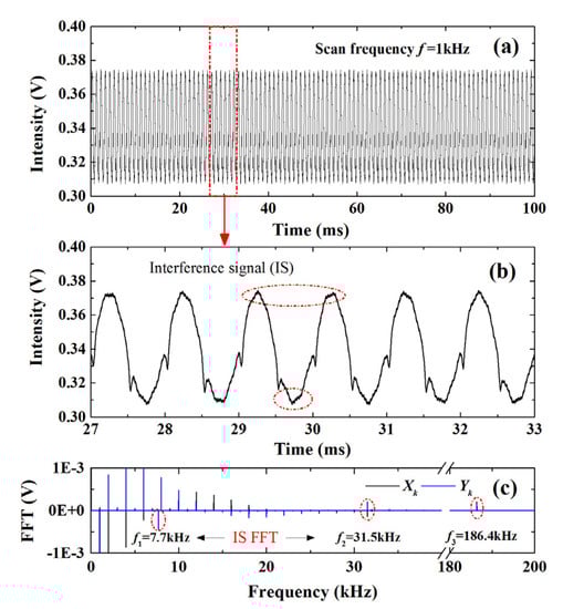 To further investigate the noise rejection ability of the proposed WM-DAS method, artificial noise signals at fixed frequencies (7.7 kHz, 31.5 kHz, and 186.4 kHz) were injected into the experimentally recorded transmitted intensity signal. Figure 4a plots the transmitted light intensity with noises (100 periods with 1000 points per period), and the section encircled by the red dashed line is enlarged in Figure 4b to highlight the detailed features. Clear distortions can be observed especially at the peak and valley locations. Figure 4c shows the Fourier coefficients of the detected transmitted light signal in Figure 4a. As can be seen, the frequency spectrum containing the information of absorption mainly locates at the integer multiples of the base frequency kf (k = 0, 1, 2…) and the FFT coefficient decrease rapidly with the increasing frequency order. Meanwhile, as labeled by the red dashed circles in Figure 4c, the frequency spectrum of the noise signals is pronounced at frequencies of 7.7 kHz, 31.5 kHz, and 186.4 kHz.