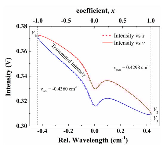 By substituting these FFT coefficients at kf (k = 0, 1, 2,…) frequencies into Equation (9), the relationship between the transmitted light intensity and x in V1V2 and V1V3 sections are obtained as shown by the red and blue dash lines in Figure 5, respectively. Furthermore, through the x→v (frequency) transformation in Equation (5), the relationship between laser intensity and wavelength can be obtained, as shown by the solid lines in Figure 5. Clearly, the nonlinear response of the laser wavelength leads to the discrepancy between solid and dash lines, and this discrepancy becomes more significant as the modulation frequency increases. It is also worth noticing that the distortions caused by the noises in Figure 4 vanish in the recovered light intensity in Figure 5, which supports the fact that the random noise and noises with other frequencies can be effectively eliminated in WM-DAS method, as only the FFT coefficients at kf (k = 0, 1, 2 …) frequency are used in the purposed method.