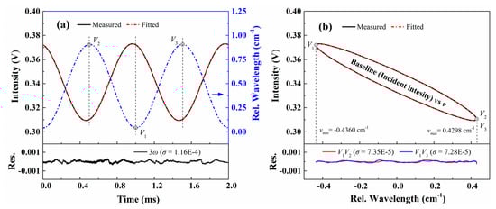 Meanwhile, the relationship between baseline and laser wavelength recovered by the proposed WM-DAS method is shown in Figure 6b. The curve shows an elliptic shape with apparent blending near the minimum frequency (V1) and the maximum frequency (V2 and V3), and such a bending feature becomes more noticeable when the scan rate increases. Apparently, the polynomial fitting used in DAS is incapable to describe this relationship precisely. In contrast, the best fits of the detected baseline with Equation (13) for both V1V2 and V1V3 edges are shown by the red dash-dot line, together with their residuals below. The standard deviations of the normalized fitting relative residual are 7.35 × 10−5 and 7.28 × 10−5 for V1V2 and V1V3 sections, respectively, which are much less than those in Figure 6a. This also indicates that the proposed method is immune to noise.