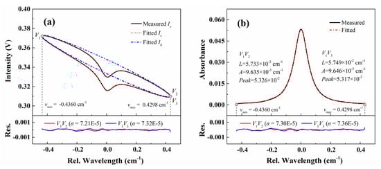 where Iv is the transmitted intensity recovered using WM-DAS method, I0 is the baseline fit by Equation (13), both of which are expressed as functions of wavelength. As for the absorbance α(v), here we adopt the Rautian line profile, which takes the Dicke narrowing effect into consideration [37]. From Equation (15) we know that both the absorbance and baseline can be directly deduced by the least-square fitting of the recovered transmitted light intensity from Section 2 with the baseline formula in Section 3.1.