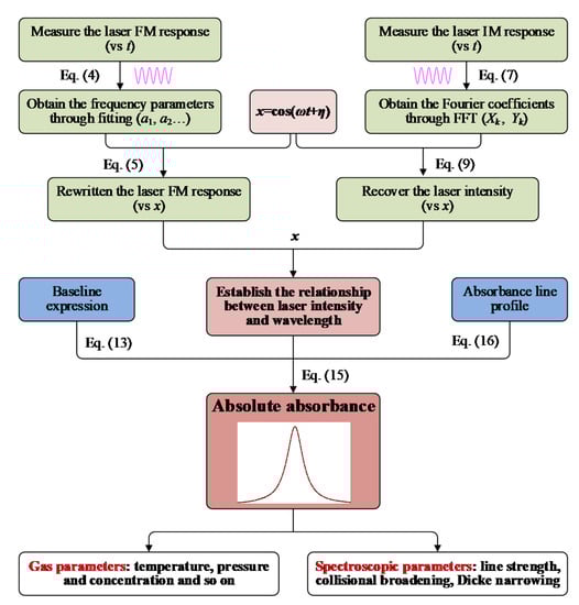The flowchart of the proposed WM-DAS method is presented in Figure 8. First, the laser wavelength in the time domain is measured with an interferometer, through which the corresponding parameters including a1, a2, φ2 can be fitted. Next, the relationship between the laser frequency and x can be obtained by substituting these parameters into Equation (5). Meanwhile, the transmitted intensity can be recorded (in this work 100 periods with 1000 points per period) and the FFT analysis is carried out on this signal. The Fourier coefficients at kf (k = 0, 1, 2…) frequency multiplications are extracted and used to recover the relationship between laser intensity and x using Equation (9). Up to now, the relationship between laser intensity and frequency can be established through the intermediate variable x. Then, by combining the baseline expression (Equation (13)), the absorption line profile, and the Beer–Lambert law (Equation (15)), the baseline and absorbance can be recovered simultaneously. Finally, the spectroscopic parameters [14,15] (including the collisional broadening coefficient, Dicke narrowing coefficient, line strength and so on) and the gas parameters [17,37] (such as the temperature, pressure, and concentration) can be calculated accordingly.