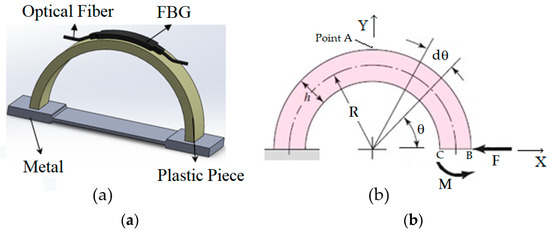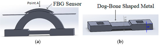 The corrosion detection sensor consists of a semicircular shaped plastic curved beam (shown in Figure 1a), attached to a dog-bone-shaped metal component (see Figure 1b), with exact material property as of the pipeline, and an optical fiber with FBG sensors. Each FBG sensor will be glued to a semicircular shaped plastic curved beam at point A, as shown in Figure 1a.