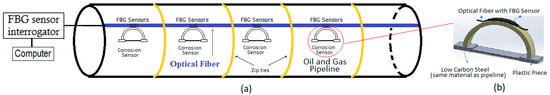 An O&G pipeline with external corrosion detection sensors, spaced every few meters. (a) Pipeline with an optical fiber and corrosion detection sensors, (b) Corrosion detection sensor.