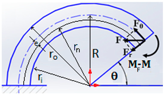 In Figure 5, for a curved beam with a rectangular cross section, the width is assumed to be W, and the outer and the inner radii are ro and ri, respectively. The location of neutral axis is given by Equation (6).