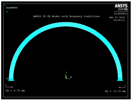 As was explained earlier in Section 2, the semicircular shaped plastic curved beam is chosen to be larger than the dog-bone-shaped metal. To insert the plastic curved beam to the metal, the beam is radially compressed inwards and inserted to the two holes of the dog-bone-shaped metal. The radial inward motion here is 1.5 mm, as shown in Table 1. The ANSYS 2D FE model is shown in Figure 6. Plane183, 2D 8-node element with “plane stress with thickness” option was used to mesh the curved beam. The thickness of the curved beam (thickness is in to the paper) is set as W = 10 mm. Both ends of the curved beam are held fixed in the “uy” direction. The left end is given ux = +0.75 mm and the right end is given ux = −0.75 mm motion, simulating 1.5 mm inward radial motion. The FE model of Figure 6 shows eight elements through the radial thickness.