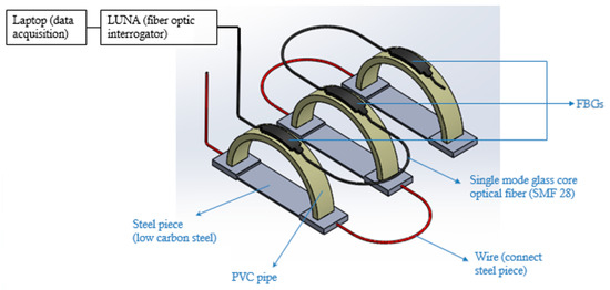 The optical fiber used in our experiment is a single mode fiber (SMF 28) with 5 FBG sensors, with FBG sensors 1 m apart. The first FBG Sensor is located at 0.5 m from the end of the optical fiber that connects to the interrogator. Glue was used to attach the outer surface of the PVC rings to the bottom surface of the FBG sensors (see Figure 9; Figure 12). To make sure the bond between the FBG sensor and the semicircular plastic curved beam remains intact at high temperature of the pipeline (≤150 °C) and high humidity of the desert for prolonged periods of time, the authors of [25] recommend a compound, based on a combination of ceramic fillers with an epoxy binder that is applied with a brush technique, and this compound can withstand temperatures in the region of 260 °C and humidity of 75%.
