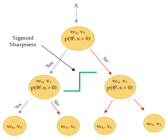 Decision jungles are the latest addition to decision forests. They are comprised of a set of decision-making acyclic graphs (DAGs). Unlike standard decision trees, the DAG in the decision jungle enables different paths from root to leaf. A DAG decision has a reduced memory footprint and provides superior efficiency than a decision tree. Decision jungles are deemed as non-parametric models that provide integrated feature selection, classification, and are robust in the presence of noisy features. DAGs have the same structure as decision trees, except that the nodes have multiple parents. DAGs can limit the memory consumption by specifying a width at each layer in the DAG and potentially help to reduce overfitting [54]. Considering the nodes set at two consecutive levels of DAGs, Figure 2 shows that the nodes set consists of child nodes and parent nodes . Let denote the parameters of the split function for parent node . denotes the categorized training samples , where it reaches node , and set of samples can be calculated from node , which travels through its left or right branches. Given and , the left and right are computed by and , respectively. indicates the left outward edge from parental node to a child node, and denotes the right outward edge. Henceforth, the number of samples reaching any child node is given as: