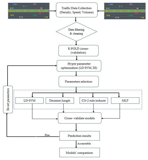 A critical review of literature for TSP indicates that time series and conventional ANN models have been widely employed for short term TSP. Although these models were aimed to fit the speed, density, or volume data as they usually inherit an overfitting issue. Thereby, the ability of models that capture generalized trends for traffic prediction is compromised. Macroscopic traffic parameters such as traffic flow, traffic speed, and density are the state variables of interest used in TSP, and are subsequently evaluated using level of service (LOS). However, training and testing the accuracy for the majority of such modeling approaches is frequently questioned. To overcome this issue, we incorporated recent AI and machine learning state-of-art-approaches such as decision jungles and LD-SVM (via hyperparameter optimization) as these methods have been rarely been explored in the existing works. Data utilized in current study was extracted from traffic simulator ‘VISSIM’, which realistically simulates complex vehicle interaction in transportation systems. Furthermore, this study has major contributions in terms of spatiotemporal analysis of different LOS classes (i.e., A-F) under different data-collection time-intervals. In general, we emphasized short-term prediction, which is considered useful for improving the productivity of transportation systems, and also beneficial in reducing both the direct and indirect costs. Moreover, this study reviewed the different techniques and approaches that have been used for short-term TSP. A comprehensive comparative analysis was also conducted to evaluate the ability and efficiency of proposed methods in terms of prediction accuracy. The specific main contributions of this paper are: