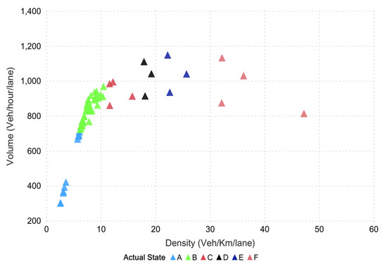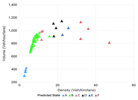 To assess the freeway operations, level-of-service (LOS), a commonly used performance indicator, was used for qualitative evaluation purposes. The data collected from the VISSIM simulation was further divided into six levels [72], wherein the LOS defines the traffic state of each level. Traffic state is usually characterized by traffic-density on a given link, and is directly related with the number of vehicles occupying the roadway segment. It also represents the transient boundary conditions between two LOS levels. Moreover, to test the efficacy, classification models were built in python scripting orange software and azure machine learning to write the required procedures for extracting the traffic parameters, and level-of-service corresponded to highway capacity manual (HCM) [43,73]. The data points (in Figure 7) represent different points in time distributed spatially, which together define the LOS at the road segment. In the mentioned figure, different colors showed the states for 15 min, which is actually the LOS divided into six sub-levels based on density along the highway segment. We termed these levels as different states (from A to F) and further evaluated them for 5, 10, and 15 min intervals. Since stratified K-fold cross validation was opted to address the issue of imbalance data, the method aimed to choose the proportionate frequencies for each LOS class. Thus, it is likely that label D or any other label will be associated with true representative class. The actual density–flow captured on a segment of the Second Ring was simulated in VISSIM for a prediction horizon of 15 min and is shown in Figure 7.