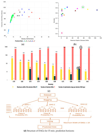 The tuning parameters in the decision jungle model were described by the maximum depth of the decision (DAGs), number of decision DAGs, number of optimization steps per decision, DAGs layer, and maximum width of the decision DAGs’. Figure 9b shows the impact of the maximum depth of decision DAGs on the accuracy of the model. The accuracy was 92% and was achieved when the maximum depth of the decision (DAGs) was 77. The best-tuned values for the other parameters are depicted in Figure 9c (such as the number of decisions DAGs, number of optimization steps per decision, and maximum width of decision DAGs’ were 22, 5786, and 19, respectively), and were obtained using 10-fold cross-validation. Since, our study considered 15 min prediction horizons as the structure of DAG is illustrated in Figure 9d, which shows the number of DAGs is 22 with a maximum depth of levels 77. The predicted state for 15 min horizons can be seen in Figure 9a.