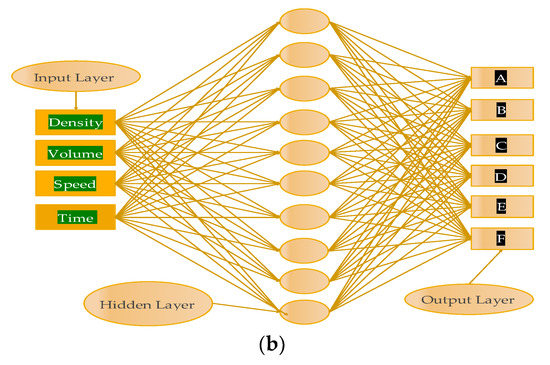 In neural networks, learning includes adjusting the connection weights between neurons and each functional neuron’s threshold. We considered one input layer and one hidden layer with 35 neurons. The input layer had four nodes: speed, density, flow, and time duration (interval). The accuracy achieved using 10-fold cross-validation for different prediction horizons was compared (shown in Table 3) against the learning rate, momentum, activation function, and epochs. Figure 11a shows the predicted state for the next 15 min horizons. The input layer, hidden layers with neurons, and output layers for the MLP network are depicted in Figure 11b.