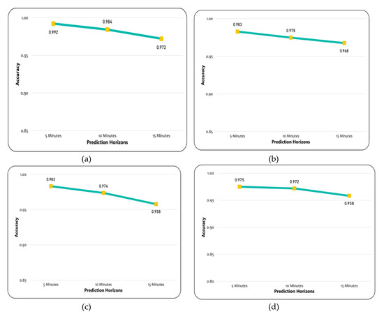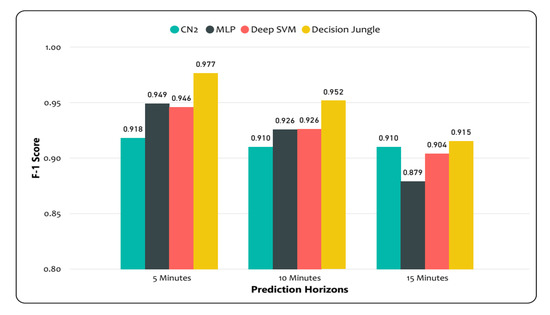 The weighted average F-1 score and accuracy were evaluated in order to assess the performances of different models. The results suggest that decision jungles outperformed the LD-SVM, CN2, and MLP, as shown in Figure 12. Additionally, the decision jungles and LD-SVM achieved a higher weighted average F-1 score. In particular, the decision jungle was found to have improved results over the LD-SVM, CN2, and MLP, and obtained high F-1 scores of 0.9777, 0.952, and 0.915 were predicated for time horizons of 15, 10, and 5 min, respectively. Similarly, the LD-SVM was slightly better than the MLP and CN2 as the F1-score was higher (0.904, 0.926, 0.946) for the 15, 10, and 5 min prediction horizons. However, the CN2 rule induction performed better, except for decision jungles, while the other models failed to achieve a higher F–1 score for the same prediction horizon. On the other hand, Figure 13a,b shows that decision jungles and LD-SVM also achieved higher accuracy when compared to the remaining models such as CN2 rule induction and MLP. It can be noted that as the prediction horizons increases, the F-1 score and accuracy decreases. This indicates that decision jungles were stable when compared to the results in accordance with time horizons of 15, 10, and 5. Unlike the LD-SVM, MLP and CN2 were found to be less effective at maintaining the stability of accuracy in different time horizons. However, the CN2 rule induction in Figure 13c,d) performed well and provided stable results only for the 10, and 15 min prediction horizons.